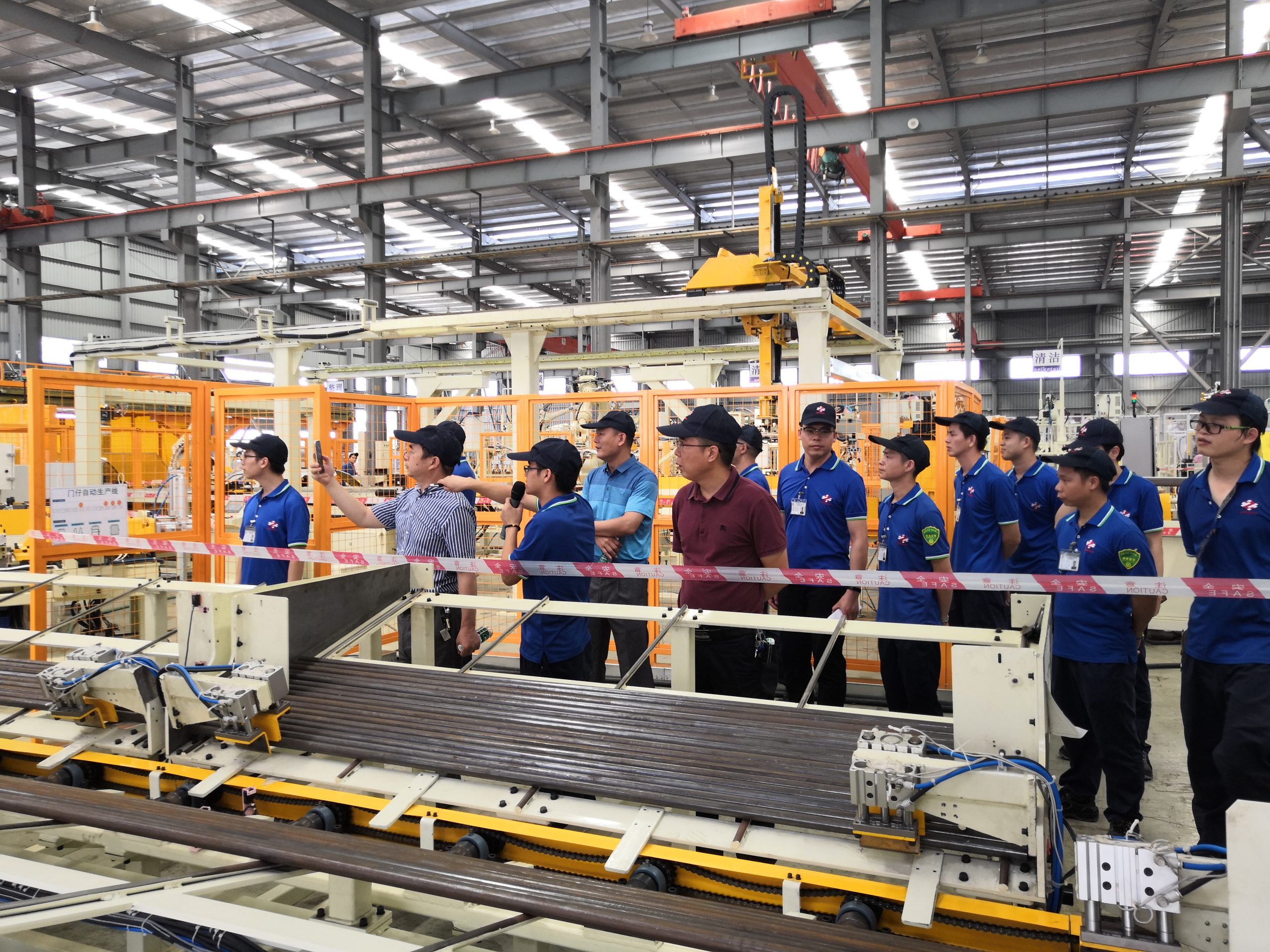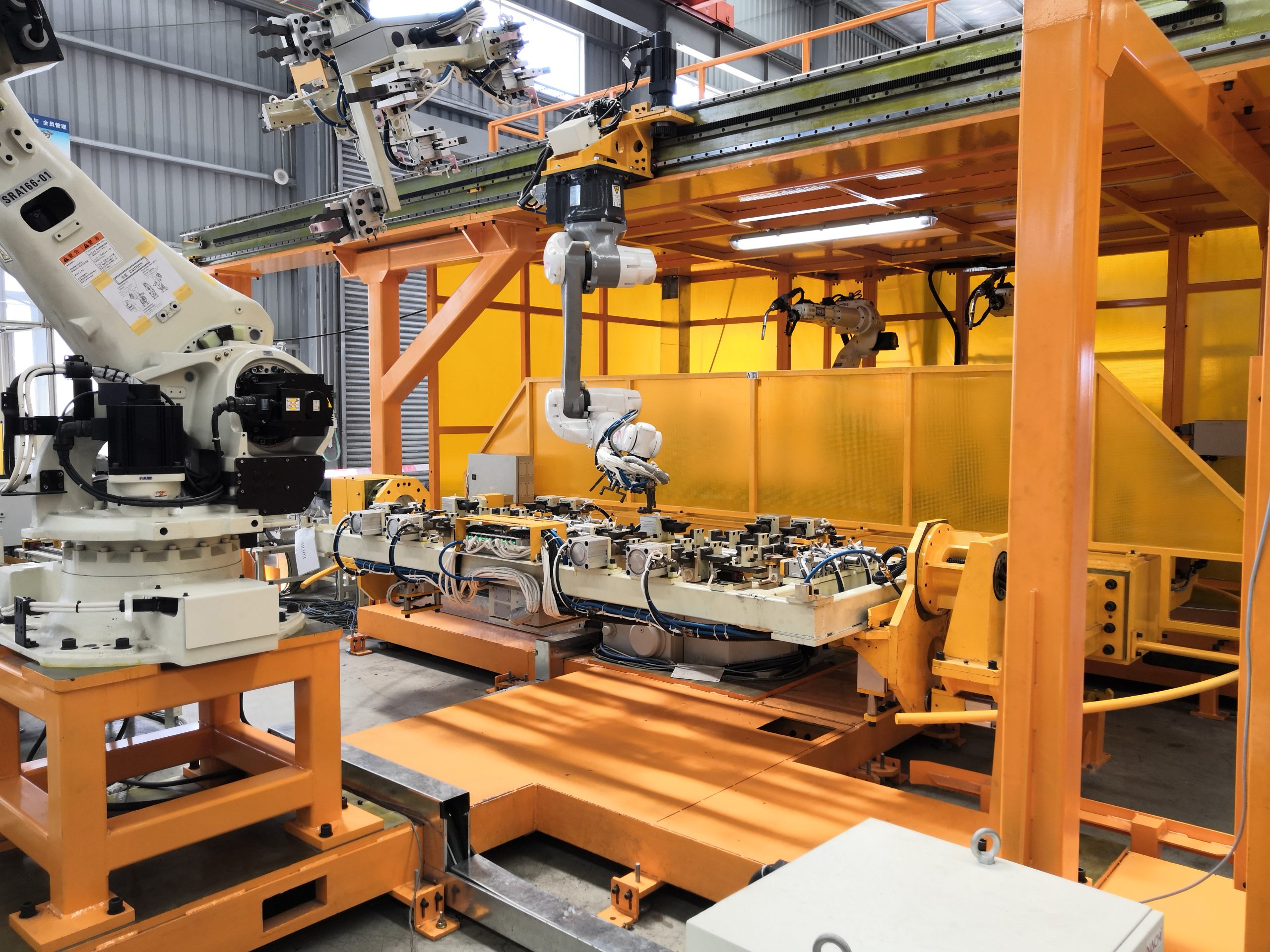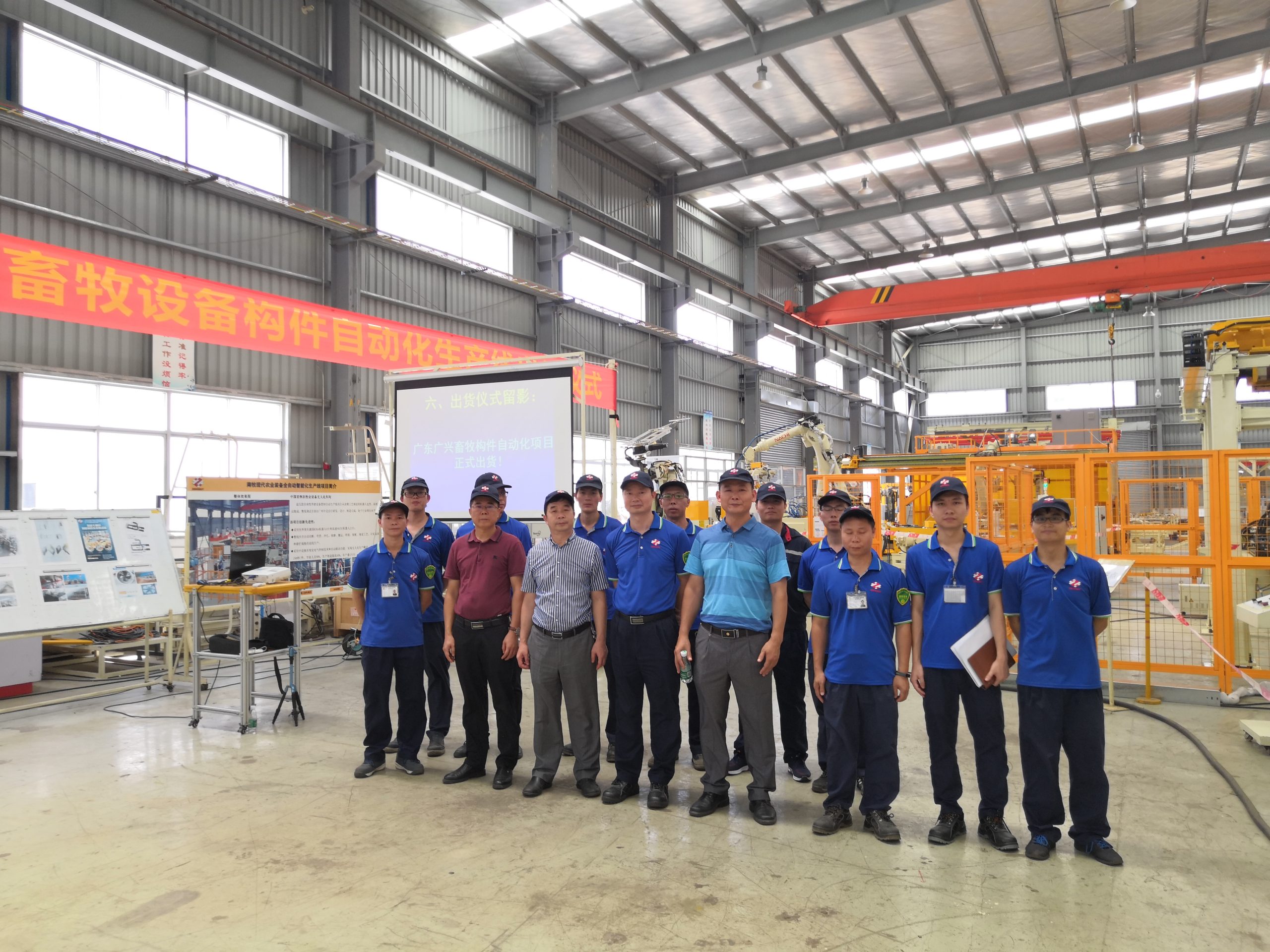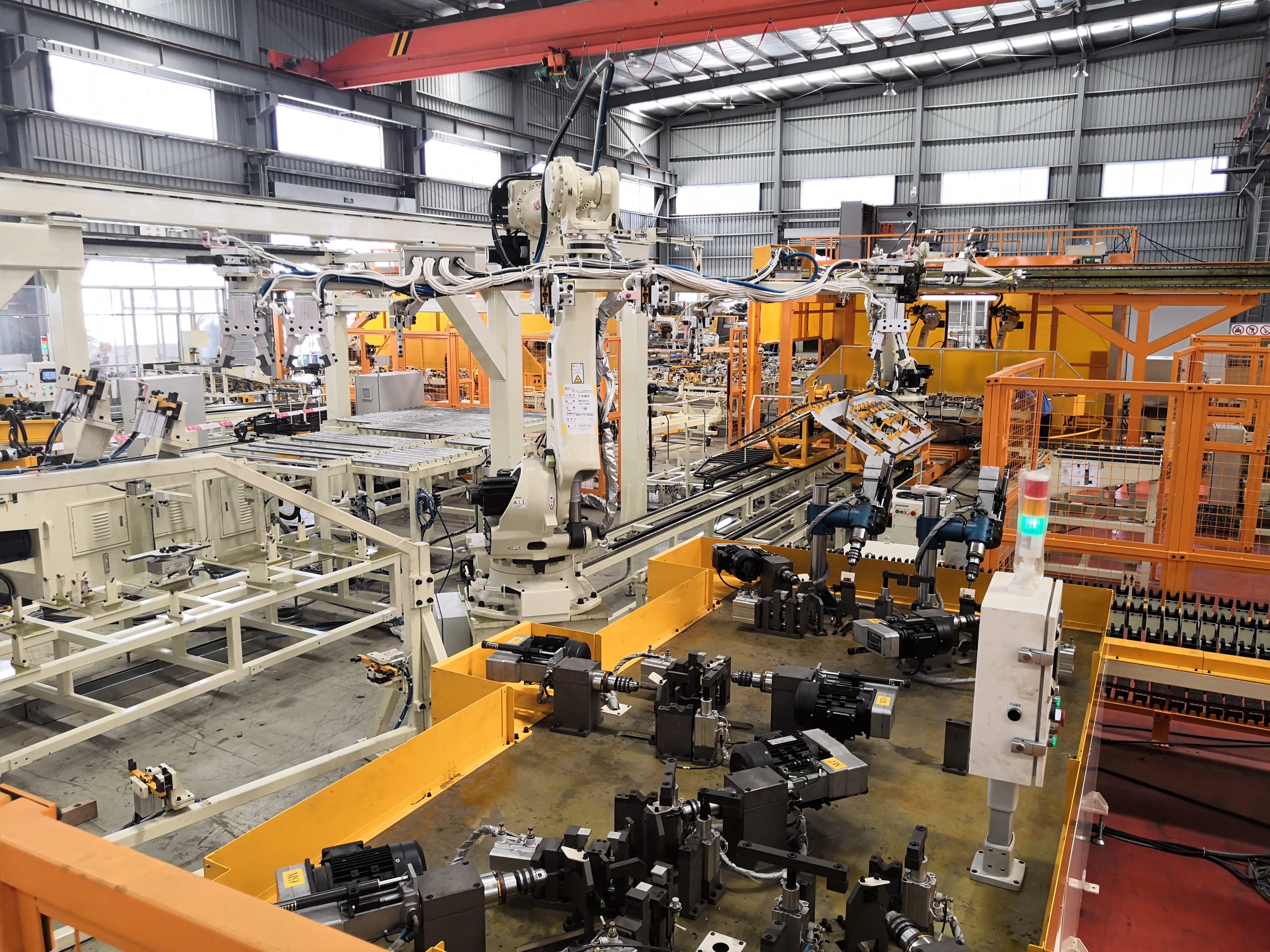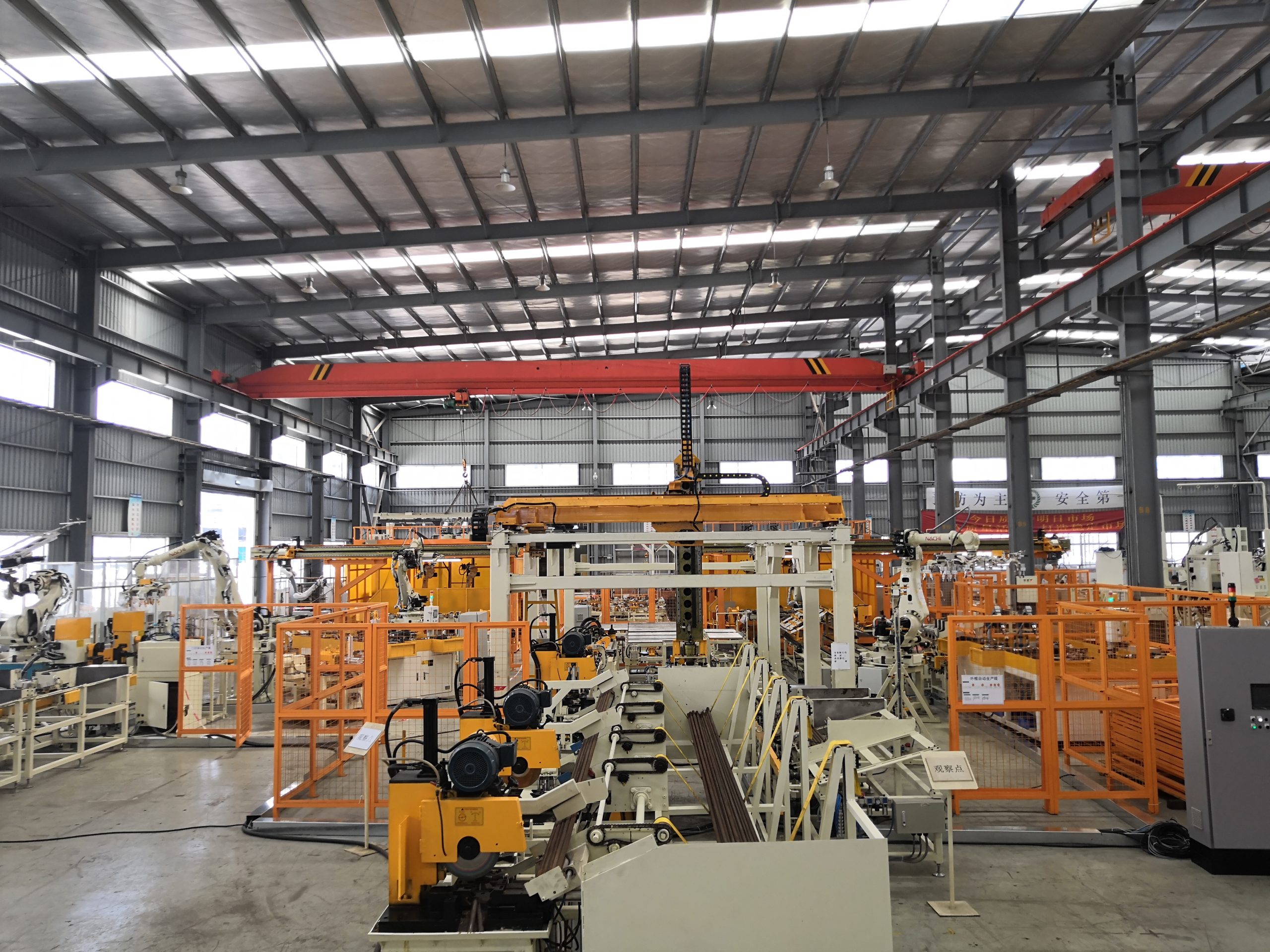 2405KUKA机器人6台和高速NACHI机器人21台,整线内含自动切断、弯管、冲孔、修磨、搬运、焊接、装配、视觉工艺,可实现多种猪栏规格混线生产,无人化生产模式、生产节拍248秒/件,节省人员90%,生产效率提高50%,年产5万台。 案例视频 ,